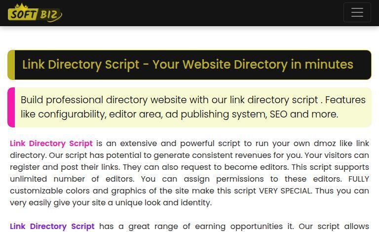 SoftbizScripts provides more than just the link directory script; however, if that is what you want, there is a link to view it on the side. The website is known for offering many PHP scripts that are cheap and easy to use.